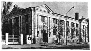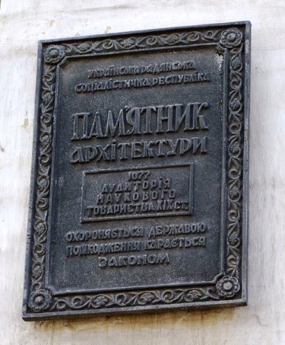 «Аудиторія Наукового Товариства. Аудиторія розташована в Петербурзькому провулку неподалік Проспекту, проти Яковлевського Скверу. Будівля має дуже скромний зовнішній вигляд півтораповерхового будинку. Усередині вона складається з трьох великих залів та кількох кімнат. Найбільша зала, так звана велика аудиторія, може бути одночасно і театром і аудиторією для лекцій. Частина зали пристосована для сцени. Унизу знаходиться так звана мала аудиторія. Як до великої, так і до малої аудиторії примикають невеликі фойє із вбиральнями та роздягальнями».