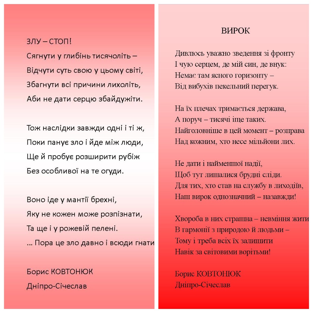 Як кажуть в народі: «Козацькому роду нема переводу», тож Слава тобі, козаче Борисе Мусійовичу! Ваш вірш: