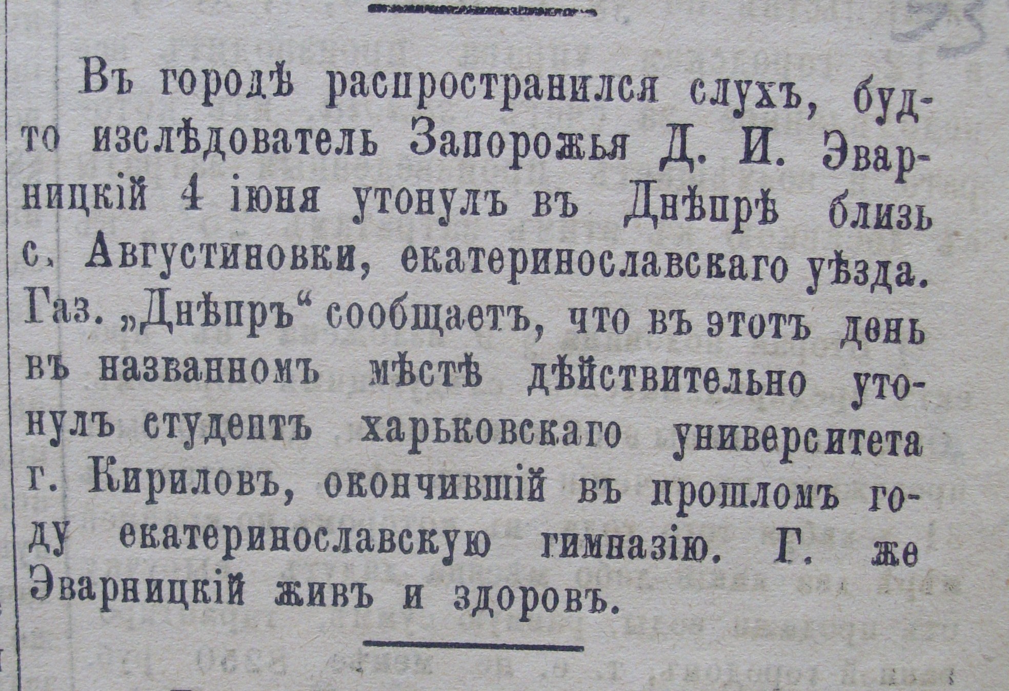 У Катеринославі розповсюдилася чутка нібито Дмитро Яворницький втопився 4 червня 1884 року біля Августинівки Катеринославського повіту (нині це Запорізька область). Газета «Днепр» сповістила своїх читачів, що того дня справді в названому місці втонув студент Харківського університету Михайло Кирилов, який 1883 року, до речі, разом з Григорієм Шрейдером складав іспити на атестат зрілості в Катеринославській гімназії. Яворницький же живий і здоровий.