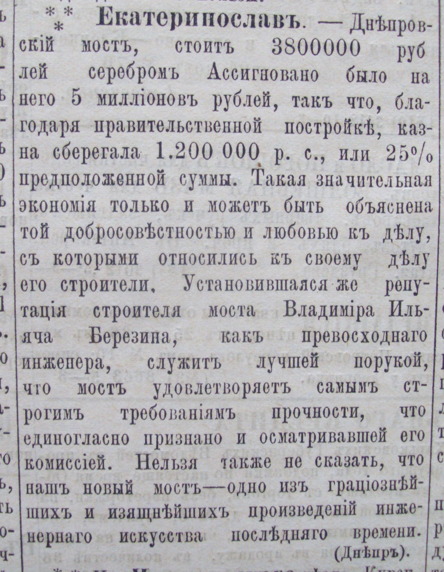Про що ще писав «Днепр»? Тут було чимало цінної для нинішніх краєзнавців інформації. Приміром, про грандіозний залізничний міст через Дніпро у Катеринославі. У рік його зведення «Днепр» писав: