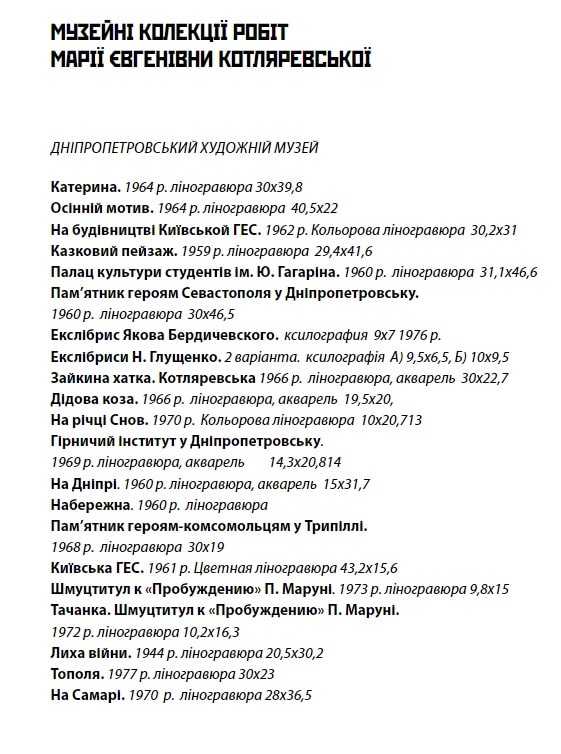 Каталог виставки М.Є. Котляревської до 60-річчя з дня народження.– Дніпропетровськ, 1962.