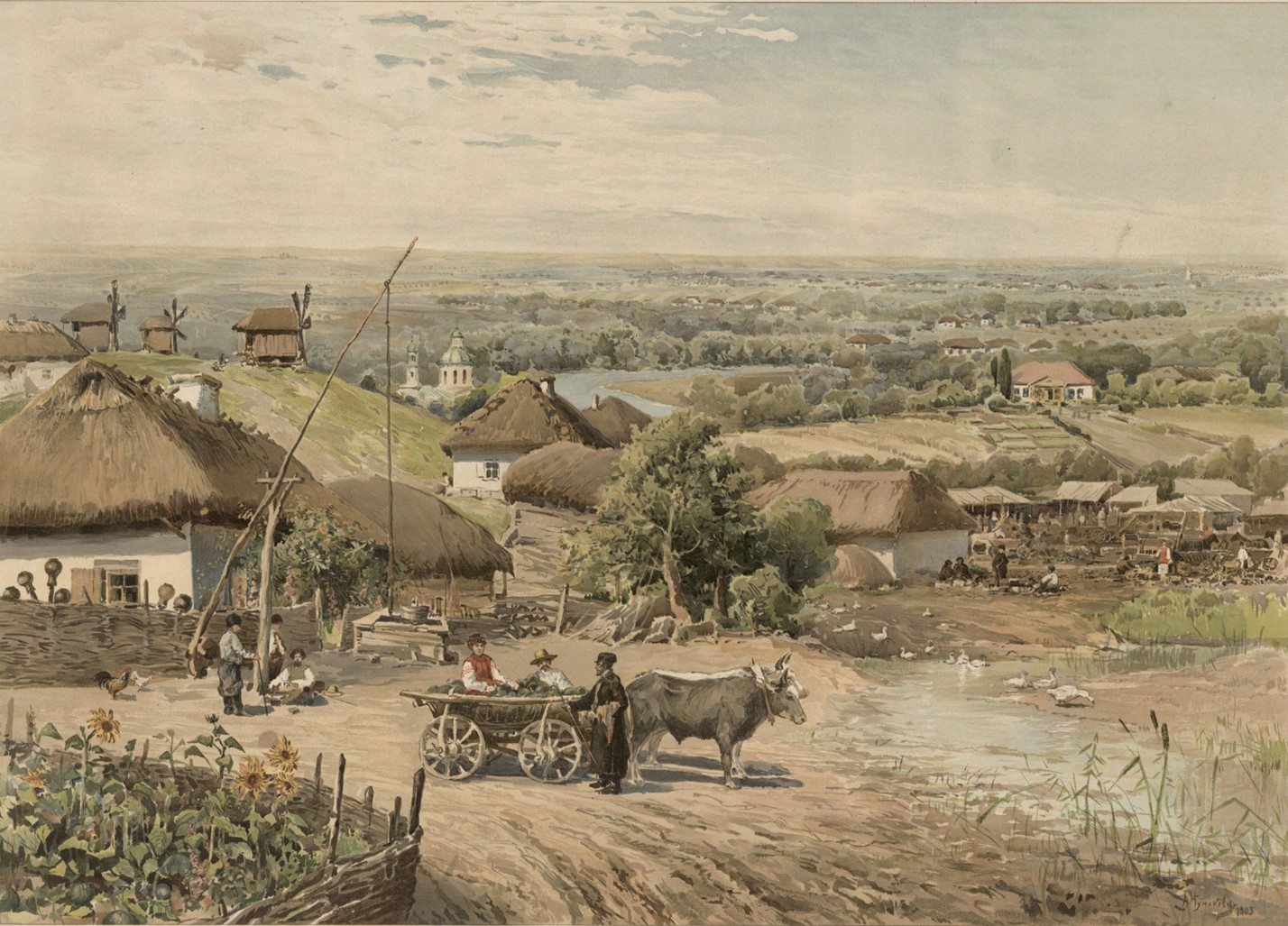 Етнограф, історик і мандрівник О.С. Афанасьєв-Чужбинський у 1856 р. здійснив подорож для вивчення побуту і звичаїв прирічкових і приморських регіонів Російської імперії, «цього племені, яке змінивши піку й шаблю на плуг і косу, мирно займається тими промислами, на тих самих місцях, де в минулому столітті розігрувалися страшні криваві драми». За результатами поїздки було опубліковано двотомне етнографічне видання «Поїздка до Південної Росії» (1861). У першому томі «Нариси Дніпра», присвяченому опису придніпровських районів, автор зазначає, що «для помелів власне у селян існує два види млинів: вітряк (вітряний млин) і водяний млин, але це ознака лише заможного господаря». Селяни сіяли яре й озиме жито, пшеницю, ячмінь, овес, просо, гречку, горох. Близькість німецьких колоній та їхнє квітуче становище впливали на місцевих жителів: деякі в господарстві мали німецькі візки, клопоталися, як домовитися з німцем, щоб збудувати млин. Так, в розмові з О.С. Афанасьєвим-Чужбинським селянин Катеринославської губернії поділився: «Ось я й небагата людина, а думаю побудувати німецьку машину (вітряк). Треба правду сказати – німець здере й дорого, та вже якщо побудує, так і онуки будуть дякувати».