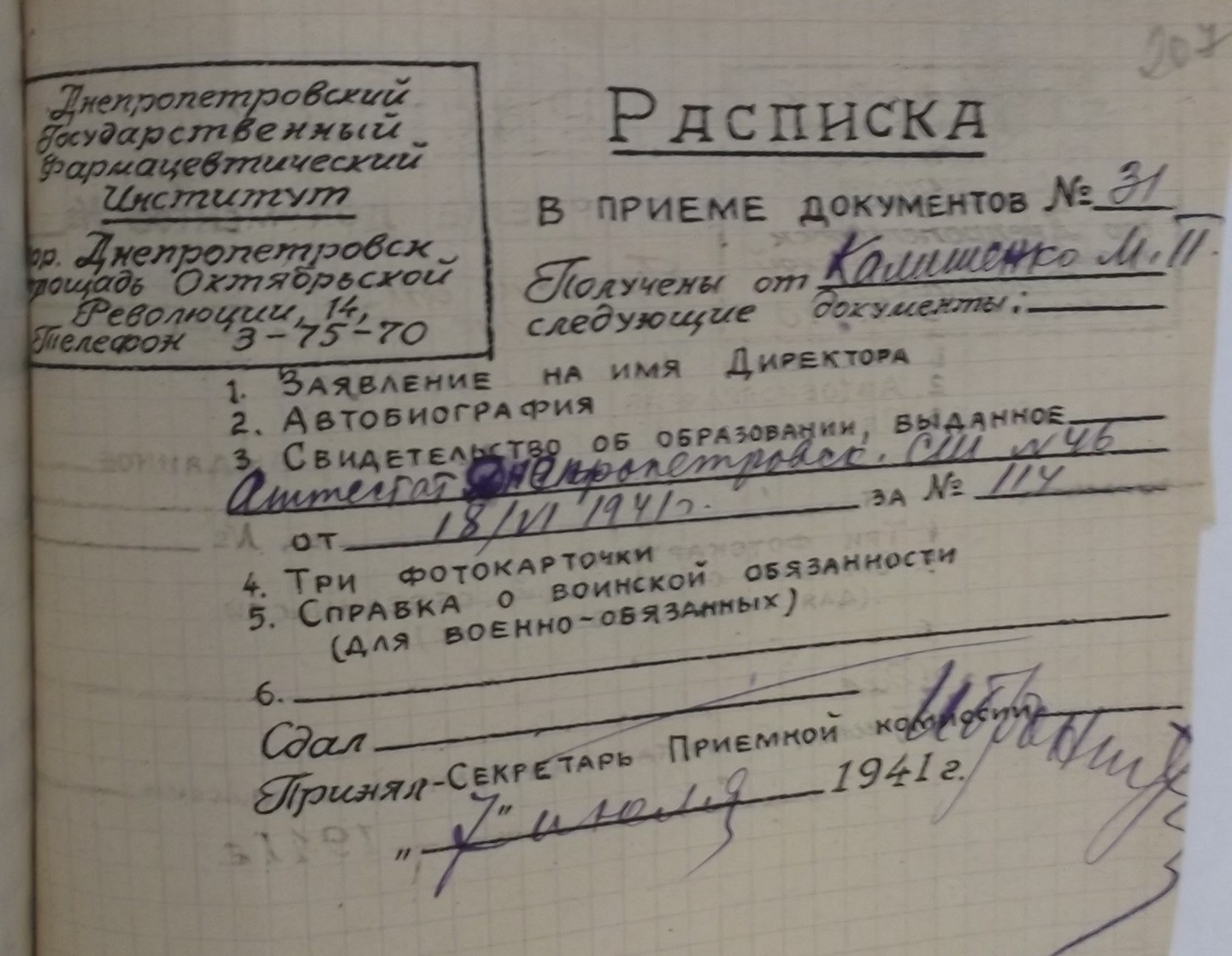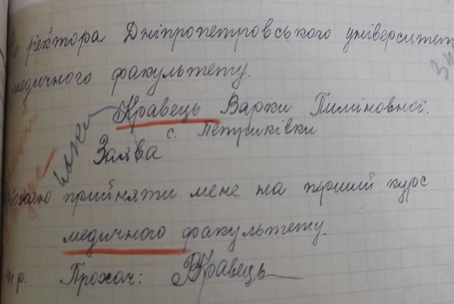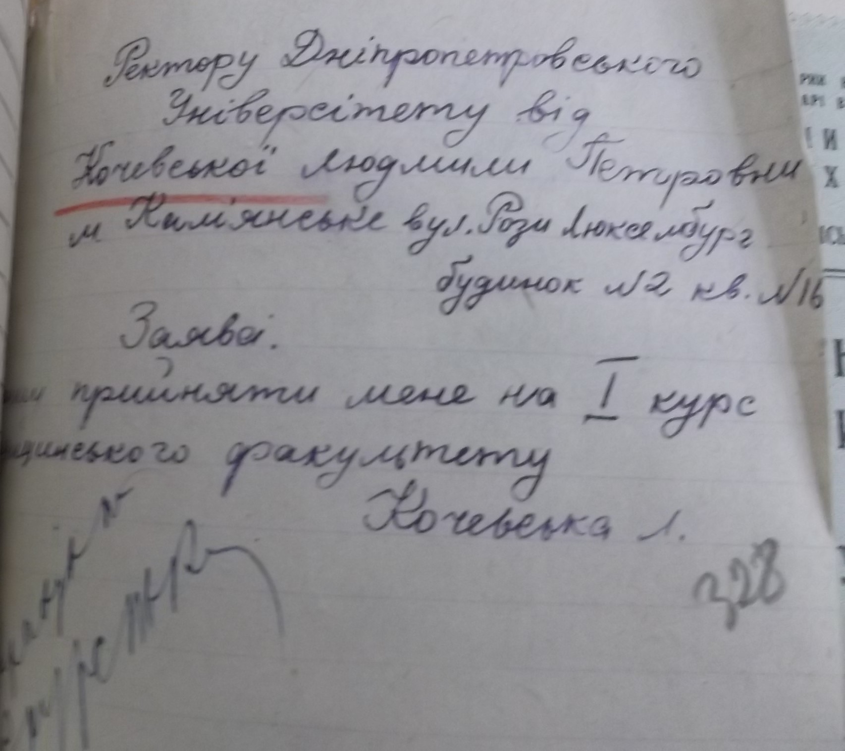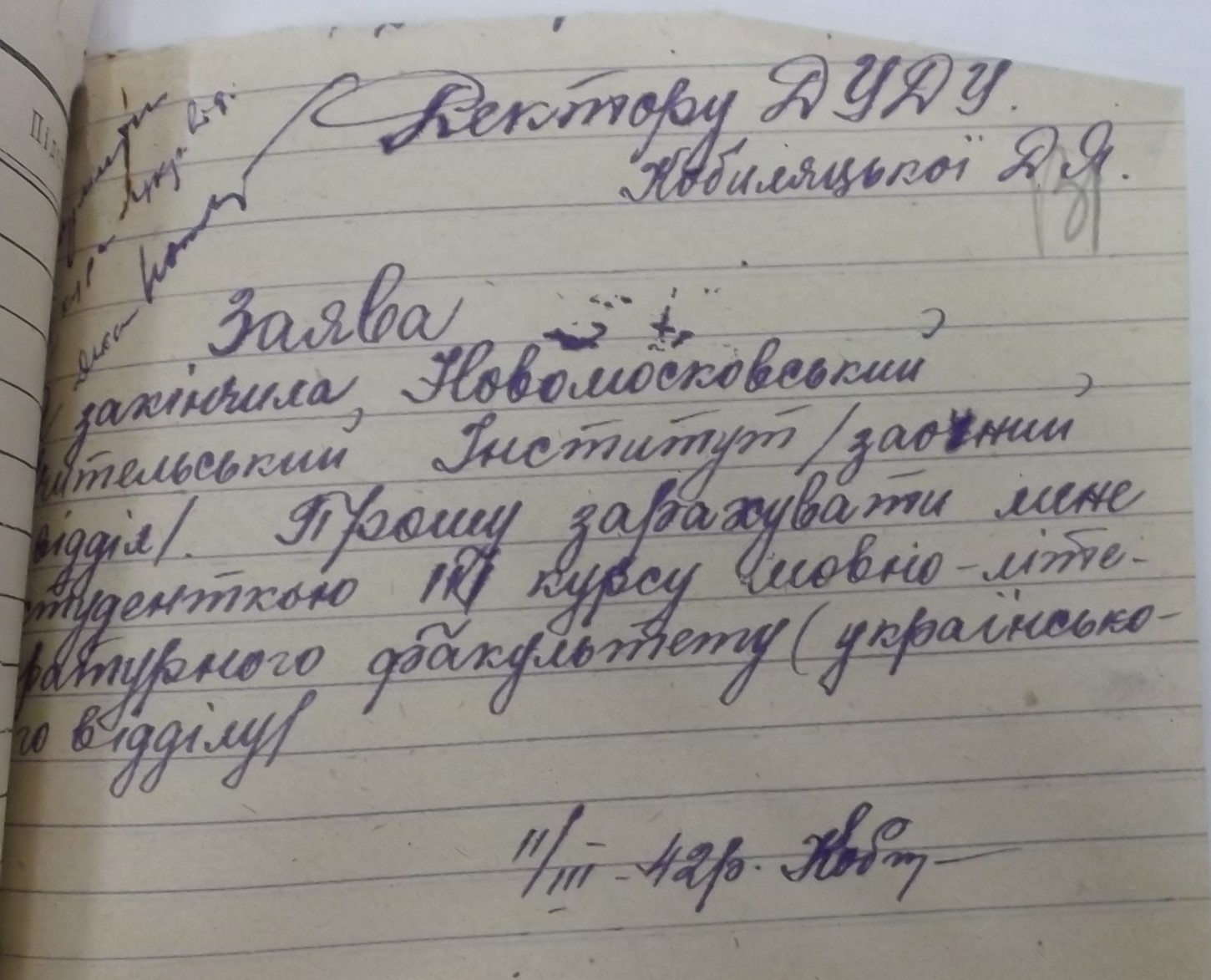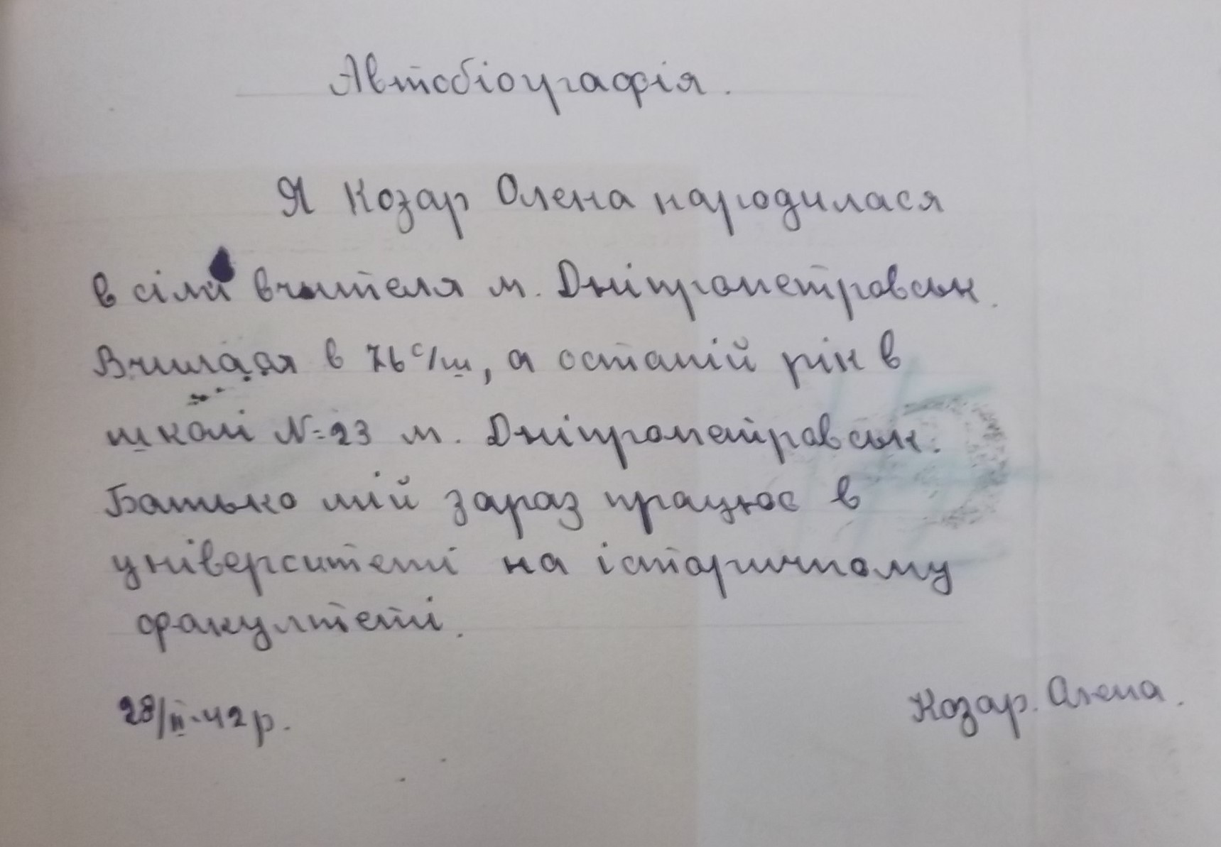Автобіографії вступників містять цікаву інформацію про свій час. Приміром, Тетяна Коваленко народилася 1922 року в Новомосковську, де батьки її працюють вчителями. 1940-го скінчила школу й вступила на геологічний факультет Дніпропетровського університету. Встигла скінчити один курс. Почалася війна. Виш евакуювався. Тож дівчина пише в листопаді 1941 року заяву з проханням прийняти її на другий курс географічного факультету нового вишу.