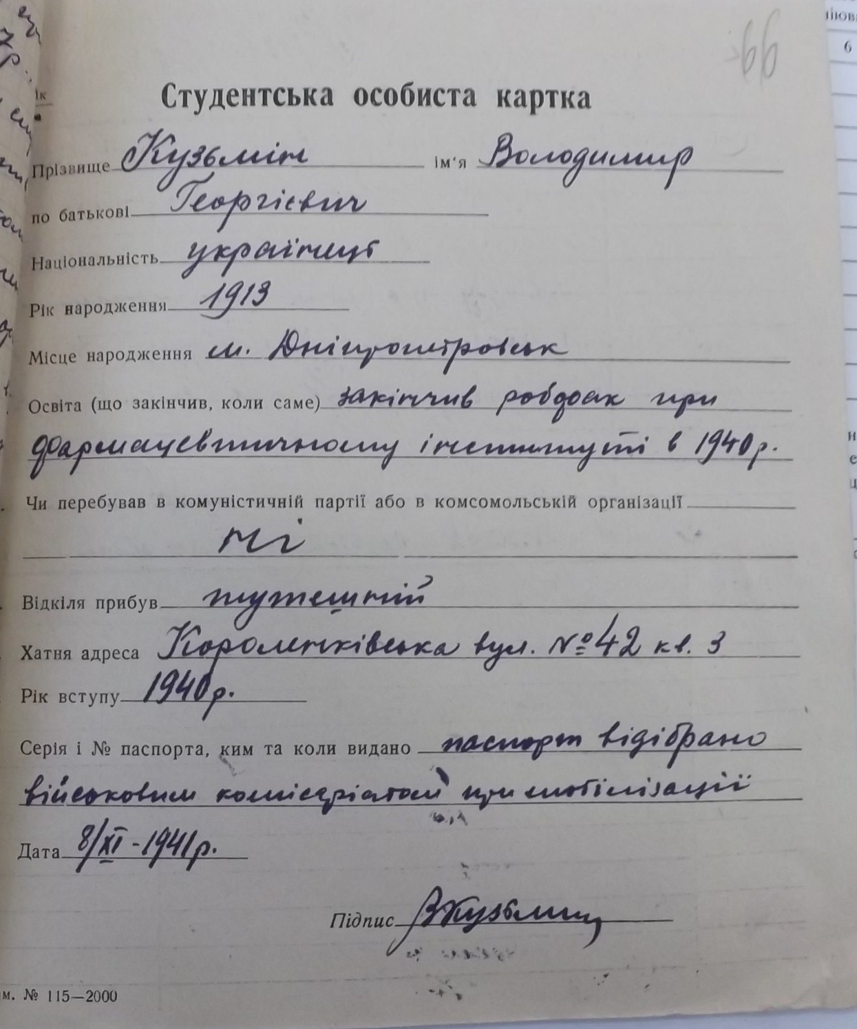 У січні 1942 року подавав заяву на вступ до вузу Володимир Пилипович Козинець, народжений 1925-го на станції П’ятихатки в родині вчителів. Там же 1941-го скінчив 10 класів. В автобіографії повідомляв:
