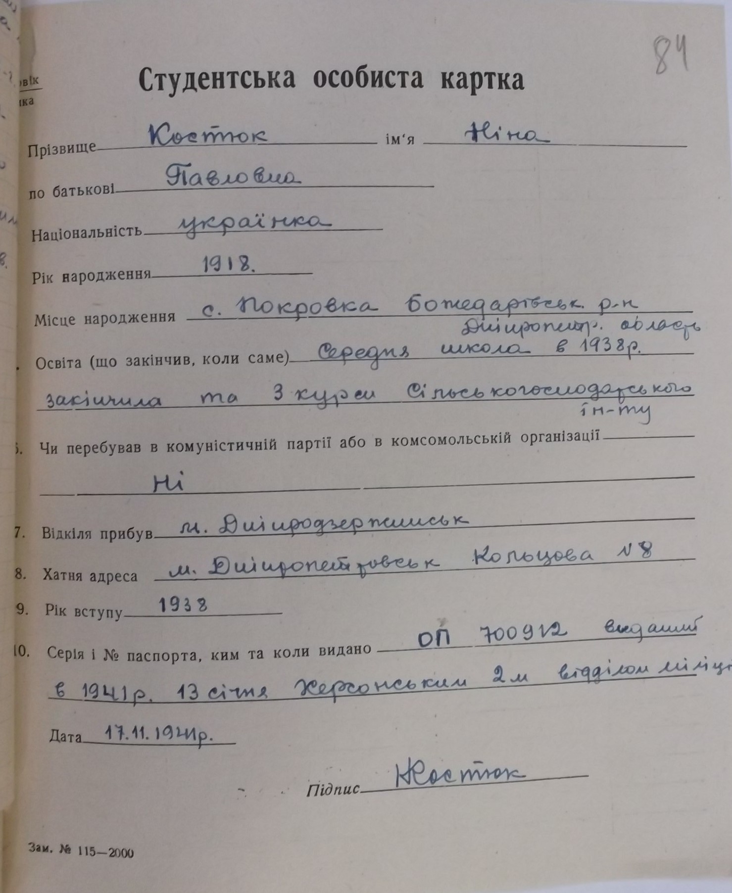 А ось студентка, яку я знав особисто. Ніна Павлівна Костюк, 1918 року народження. Донька священника. Народилася в селі Покровка Верхньодніпровського повіту (в радянський час –Божедарівського, потім – Криничанського, зараз – Верхньодніпровського району). 1938 року закінчила середню школу. Згодом – три курси Дніпропетровського сільськогосподарського інституту. Паспорт отримала в січні 1941 р. в Херсоні. А тут – війна. До Дніпропетровська прибула з Кам’янського. Чом така строкатість населених пунктів? Та через те, що була донька репресованого священника. Так простіше було замітати сліди від радянської влади, яка скрізь пхала свого червоного носа.