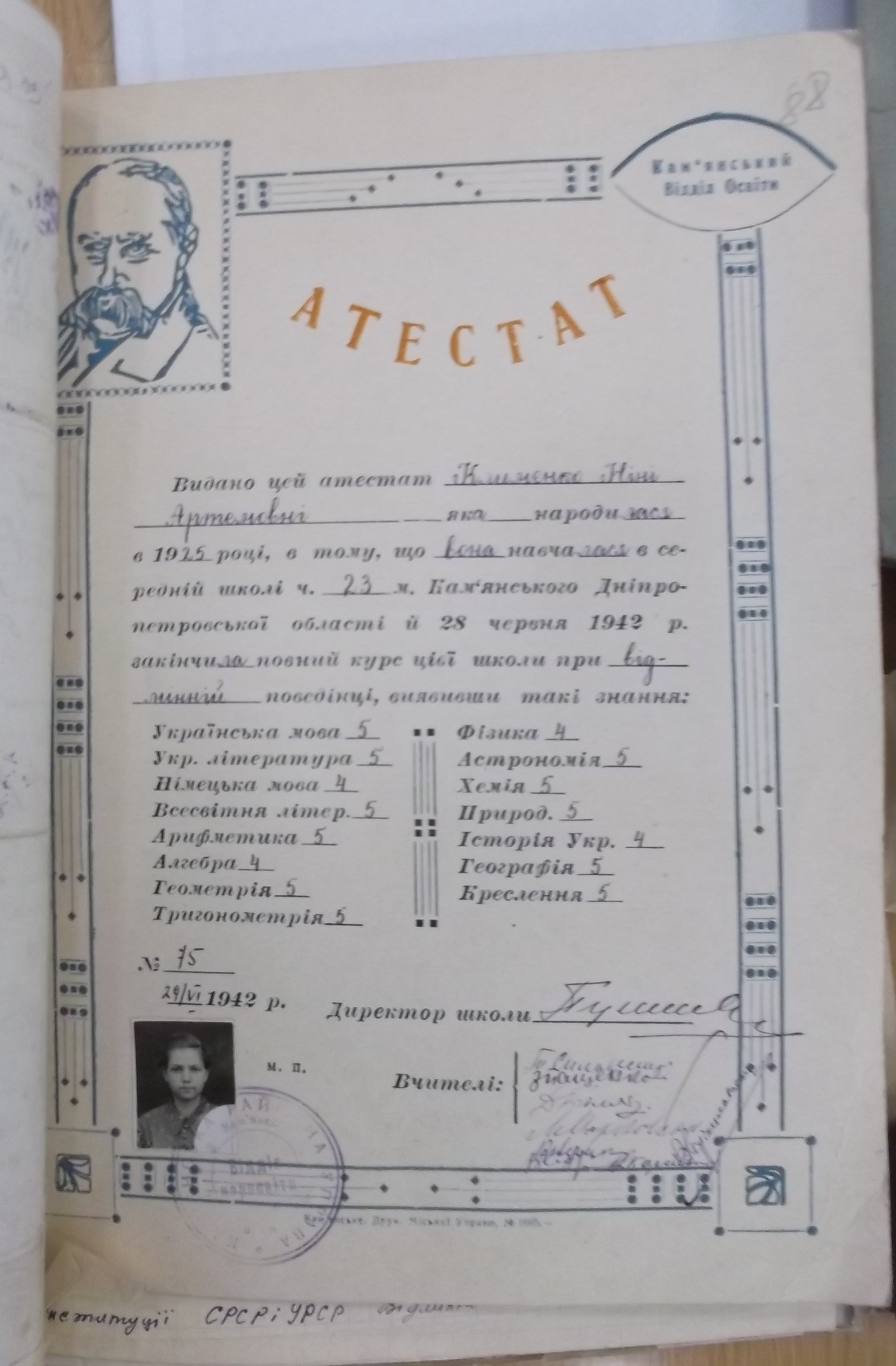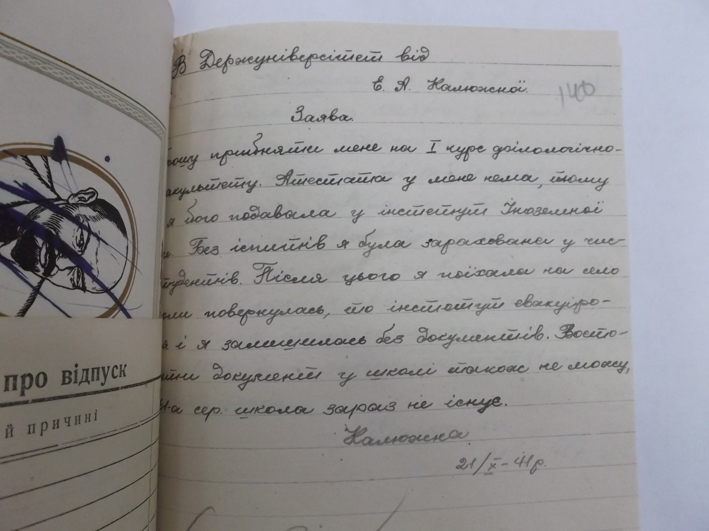 «Атестата у мене нема, тому що його подавала в інститут іноземних мов. Без іспитів я була зарахована у число студентів. Після цього я поїхала на село, а коли повернулась, то інститут евакуірувався, і я залишилась без документів. Востановити документи у школі також не можу, бо 61 середня школа зараз не існує».