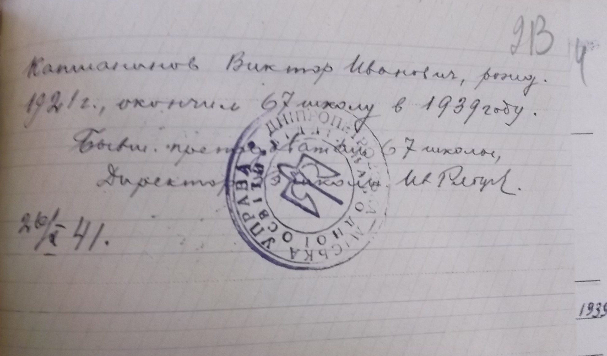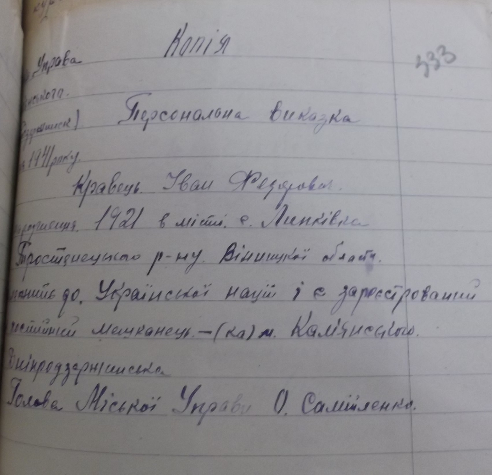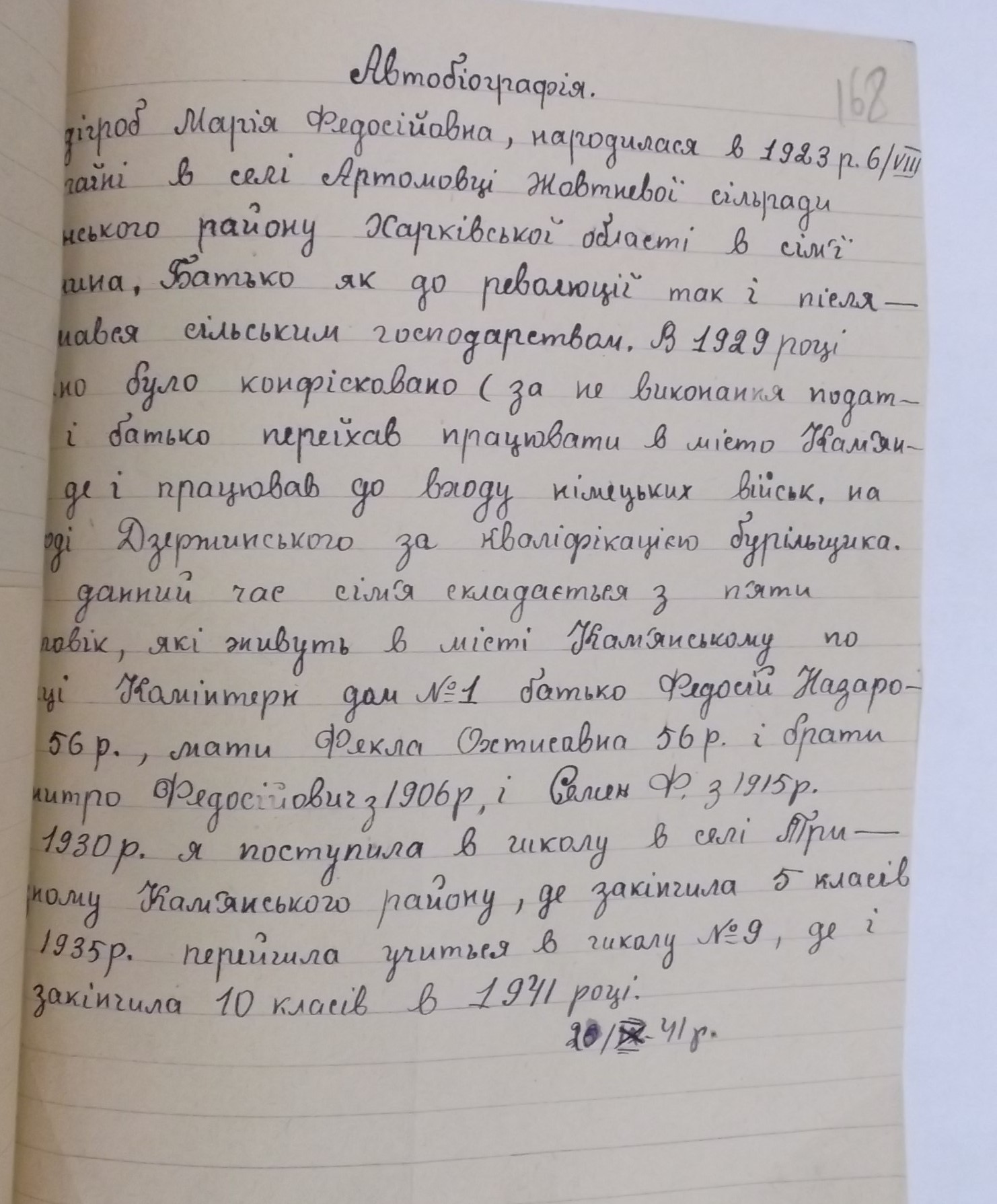 «Батько мій був репресований більшовиками. Мати моя працює учителем в м. Новомосковськ. Я зараз у П’ятихатках учителем неповної середньої школи. Із закриттям шкіл я зараз працюю в П’ятихатському статбюро».