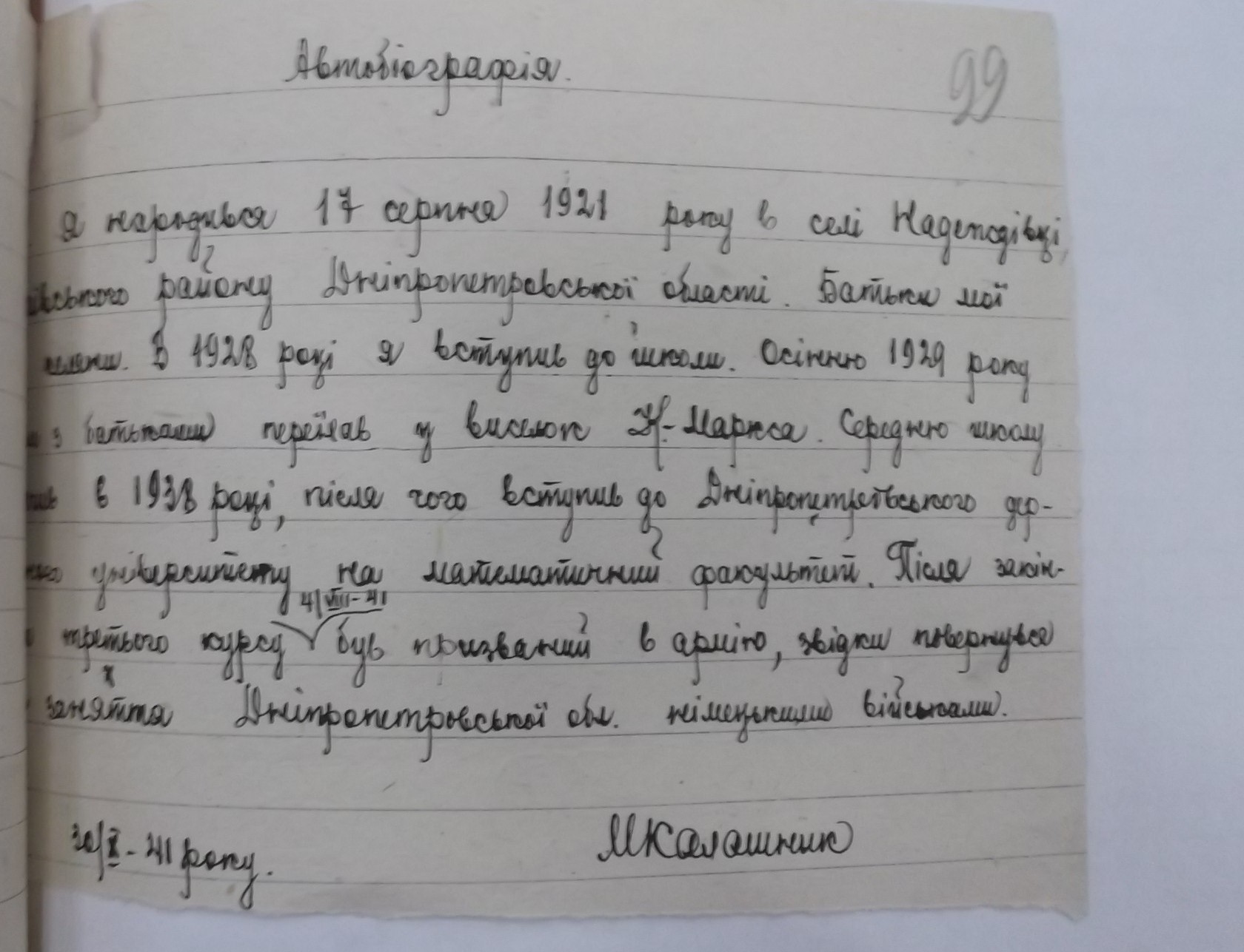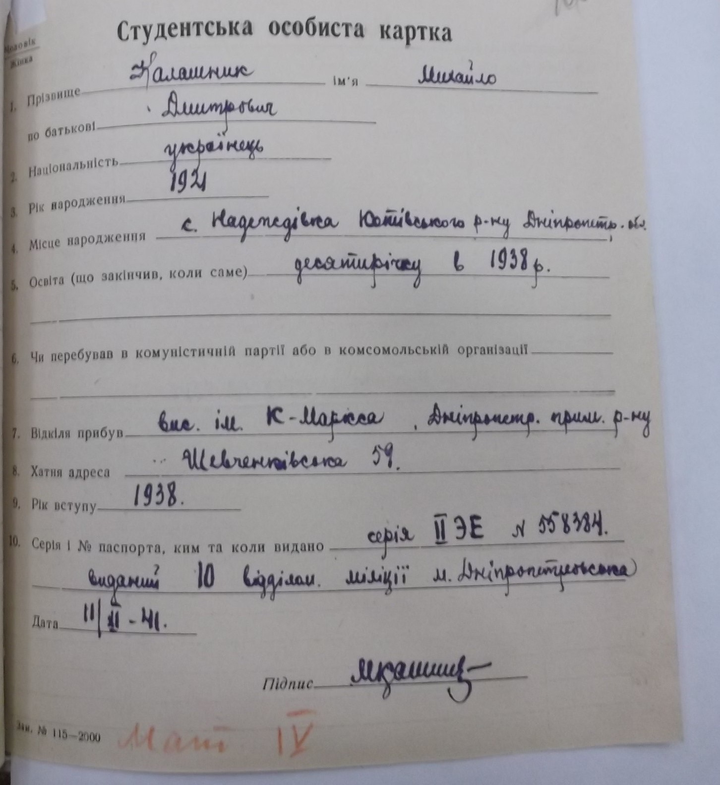 Ще один студент, Михайло Дмитрович Калашник, народився 1921 року в селянській родині в с. Надеждівка, яке до війни належало до Котівського району. Хлопчик 1928 року пішов до сільської школи. А вже восени 1929-го батьки переїхали з села у виселок К. Маркса Дніпропетровського приміського району (нині це житловий масив Ігрень у складі м. Дніпро). З якої речі батьки-селяни полишають село? Та тому що 1929-й – «рік великого перелому», початку масової колективізації, від якої раз-у-раз тікали селяни. Тож далі Михайло вчився під Дніпропетровськом. 1938 року вступив на математичний факультет ДДУ. Після закінчення третього курсу в липні 1941-го призваний до Червоної армії, звідки повернувся вже після заняття Дніпропетровська німецькою армією. 30 жовтня 1941 року подавав заяву до українського університету.