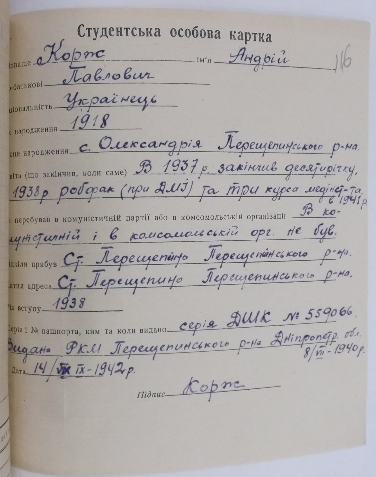 Андрій Павлович Корж народився 1918 року в с. Олександрія Перещепинського району. 1937-го закінчив десятирічку і наступного року – робітфак при медінституті. До 1941 року скінчив три курси цього вишу. Студентську облікову картку в новому виші заповнював у вересні 1942-го.