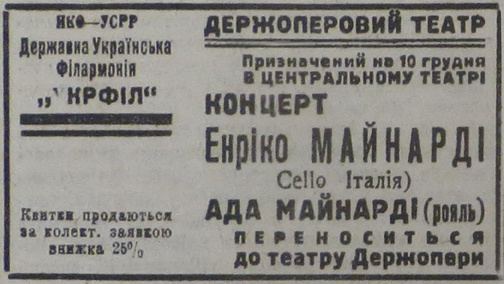Наведена нами газетна афіша – рідкісне свідчення роботи УКРФІЛу (Української філармонії) на початку 1930-х. Це був період, коли попри складну соціально-економічну ситуацію в республіці влада продовжувала запрошувати топових європейських артистів для підтримки іміджу «культурного будівництва».