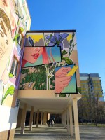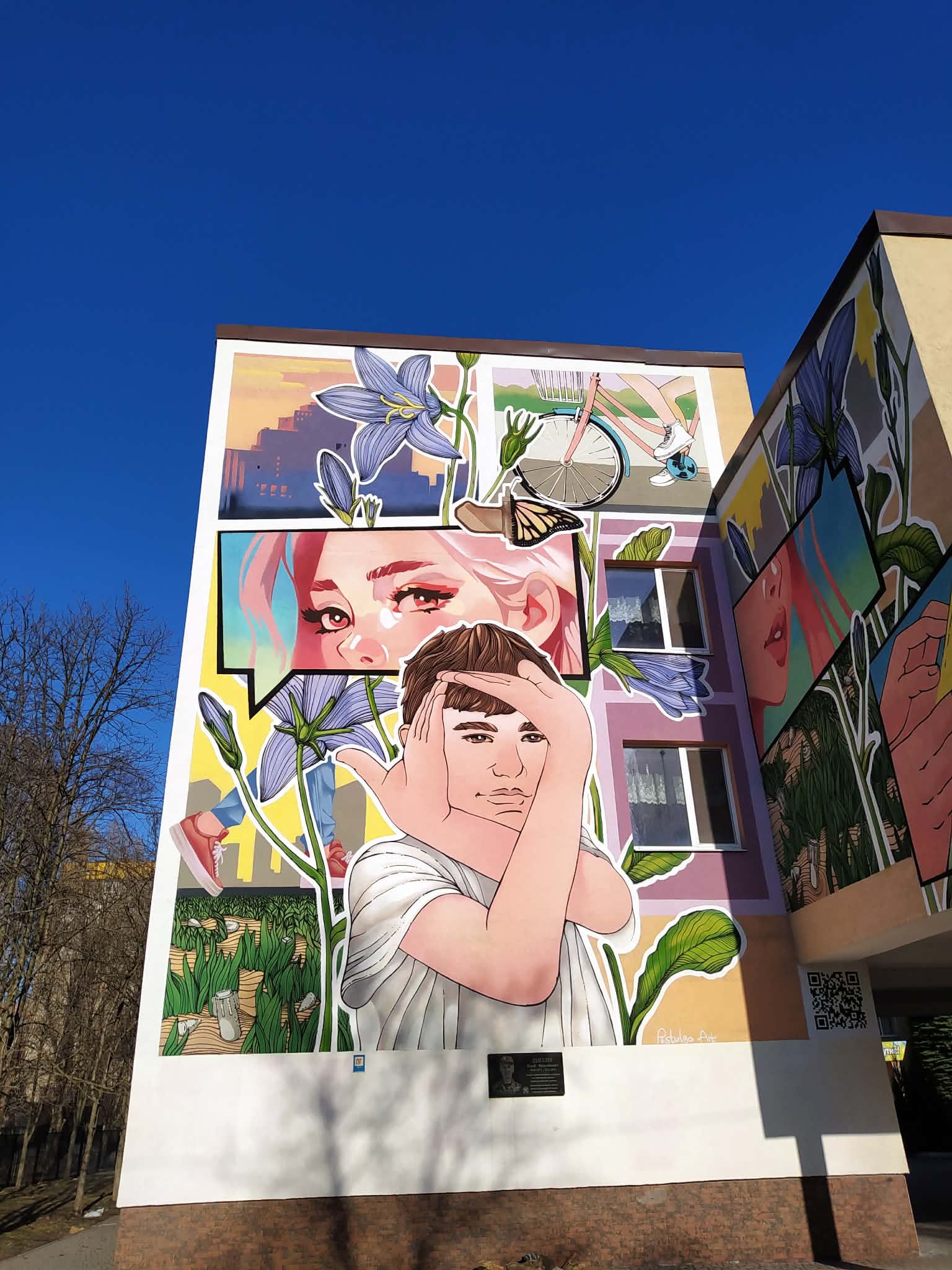 https://www.instagram.com/post.oleksii/,https://www.facebook.com/Postulga.art.family/?locale=uk_UA який намалював мурал усього за тиждень. Ескіз зображення попередньо бувузгоджений з департаментом гуманітарної політики.